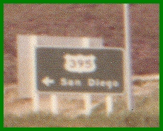 Above: Carmel Mountain Road overcrossing in 1967. Note the use of yellow striping in the middle of the road; this is the earliest I have seen it used. Left: Since I-15 ended in San Bernardino, this freeway was signed solely as US 395. This has significance since this freeway was built as US 395 after the 1964 renumbering and was not at the time considered a future upgrade to an Interstate highway. |