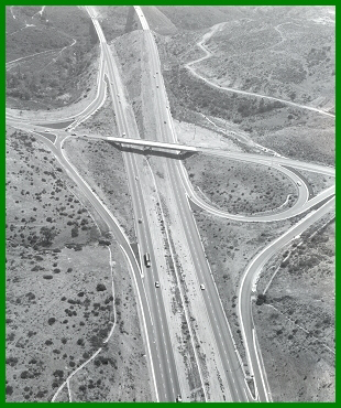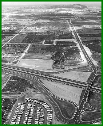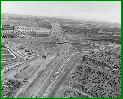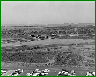 Portions of the 1947 expressway were upgraded to full freeway status by the end of the 1950s. An example of this is the intersection with Clairemont Mesa Blvd. Much has changed since these pictures were taken in 1959; the surrounding area is almost completely built out. The freeway itself is now eight lanes wide and Clairemont Mesa Blvd has been widened with a parallel bridge. The overcrossing is still there, complete with the steel guardrails and the cloverleaf turns still exist.