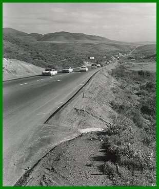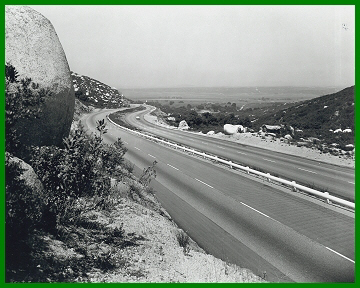 | Two views of four lane US 395 expressway. The photo on the left is from 1952 and shows a brief section of expressway that was in use until the eight lane I-15 covered it in 1973. It is located on the grade just to the south of the I-15/SR-79 intersection. The photo at right shows the US 395 expressway just to the north of Escondido in 1997; it was bypassed by I-15 in 1976. |