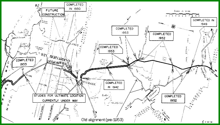 | This map shows the construction of US 395 in Riverside County between 1942 and 1950. The construction done in 1942 was a wartime project to widen the highway to four lanes to allow easier access to what is now March Air Force base. The other projects included widening the road through Cajon Pass (see next page), the construction of portions of the Riverside Freeway (then the La Cadena Freeway), and a bypass of Lake Elsinore, which took several miles off of the route. |