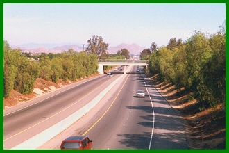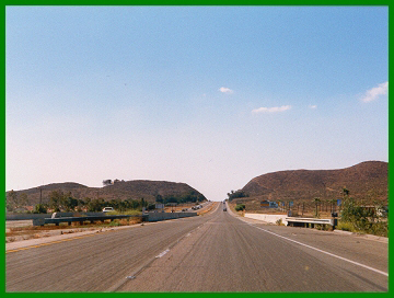 | Below and Right: US 395 near Perris looking to the two grade separated interchanges. The picture at right was taken from approximately the location of the I-215/SR-74 (west) interchange and shows the transition from two to four lanes. | ![]() |
