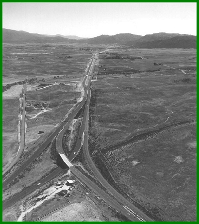 SR-71 crosses US 395 on the separation structure, heading to the left. US 395 was a four lane expressway in the picture, but just to the north it went down to two lanes, following what later became the southbound lanes. The grading work for the future northbound lanes had already been done, but paving was held off since there was not enough traffic to justify it being four lanes its entire length. Photographs courtesy of the Caltrans Library. |